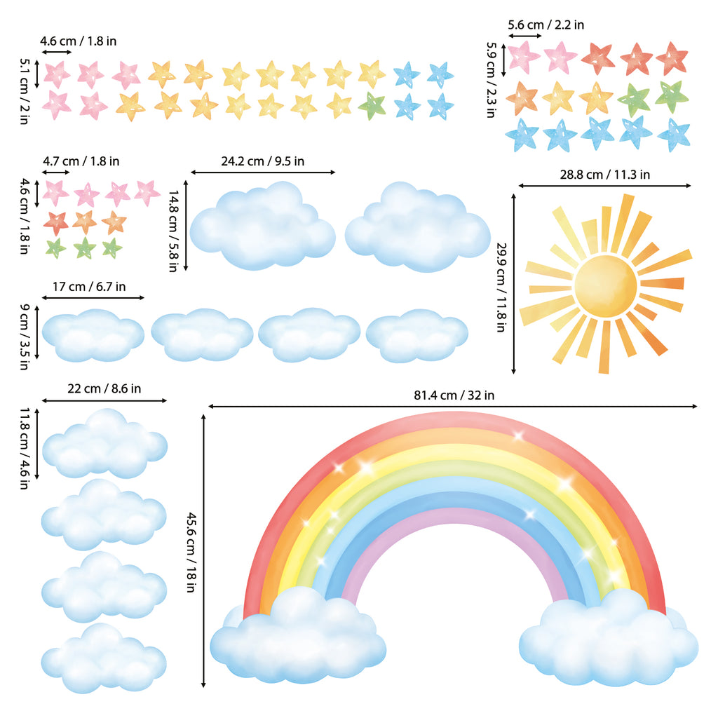 A fabulous set of Rainbow, Sun, Clouds and Stars are a fantastic collection for boys or girls wall.