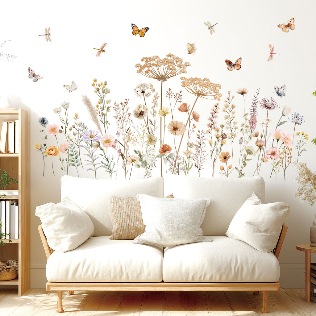 This delicate wall sticker set features an elegant mix of hand-painted wildflowers, seed heads, butterflies, and dragonflies in soft, earthy tones — perfect for creating a warm and peaceful ambiance in your living room, bedroom, hallway, or meditation space.