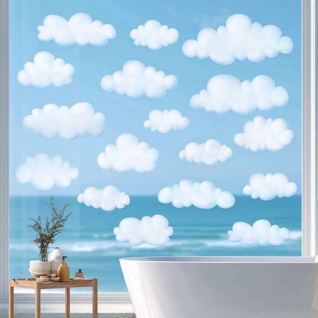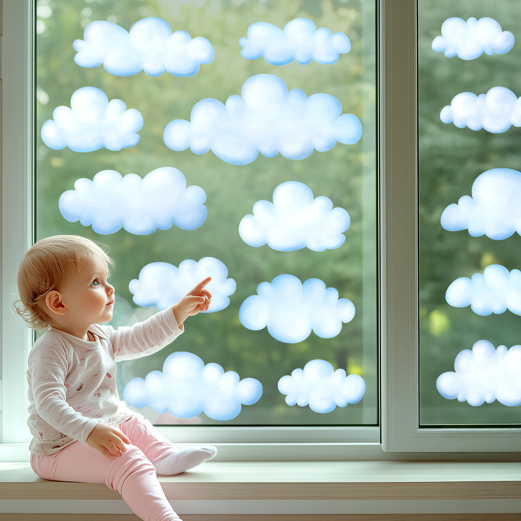 Create a calm and airy atmosphere with these soft white cloud window clings. Featuring fluffy cloud shapes in various sizes, this set gently filters light while adding a dreamy sky feel to children’s bedrooms, nurseries, playrooms, or bathrooms.