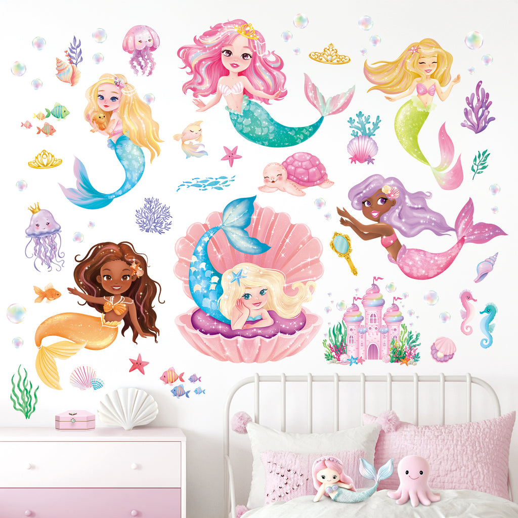 This enchanting set features a group of adorable mermaids, friendly sea creatures, and dreamy underwater elements like castles, jellyfish, seahorses, starfish, and more — perfect for turning any child’s room into an undersea paradise.